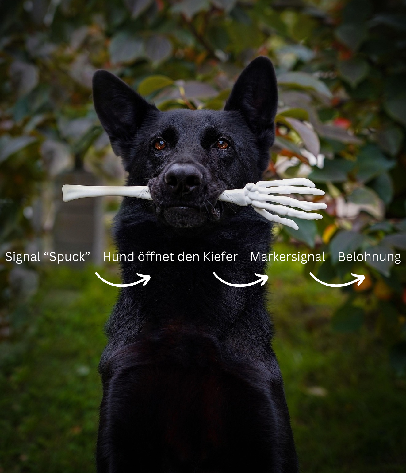 Wenn dein Hund draußen etwas findet, was nicht in sein Maul gehört, wünschst du dir sicher, dass er es schnell und zuverlässig auf Signal ausspuckt. Klar, es wäre noch besser, wenn er draußen nichts mehr aufsammelt, aber du hast einen Hund zu Hause und er nutzt sein Maul wie du deine Hände und frei zur Verfügung stehende leckere Sachen werden nun mal gern verputzt.
